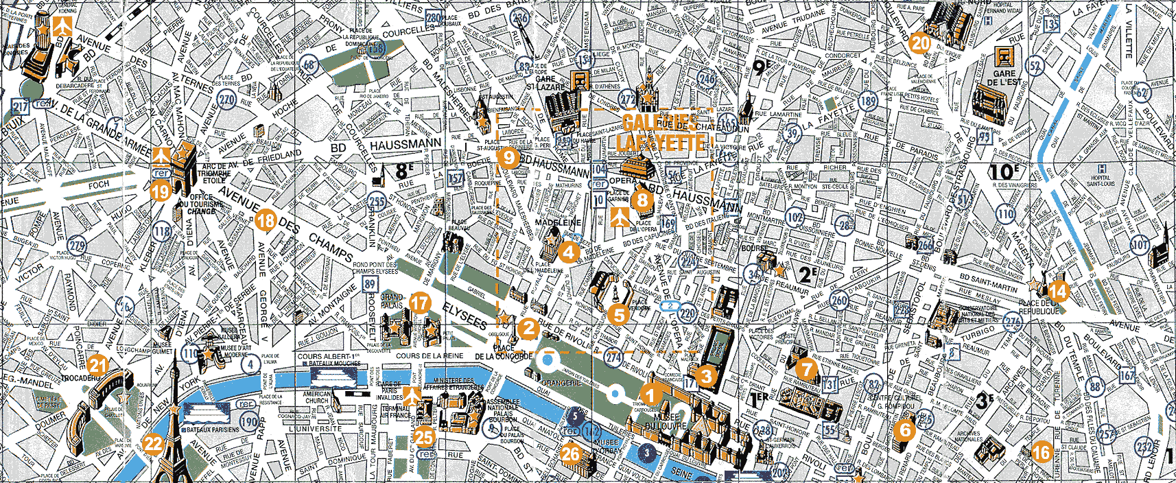 | (8)歌劇院 (9)霍斯曼大道 (14)共和廣場 (16)畢卡索美術館 (17)大小皇宮 (18)香榭大道 (19)凱旋門 (20)火車站(北站、西站) |