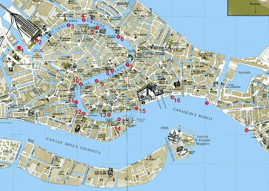| 威尼斯觀光地圖(數字表示水上巴士在大運河停靠的站名) |
